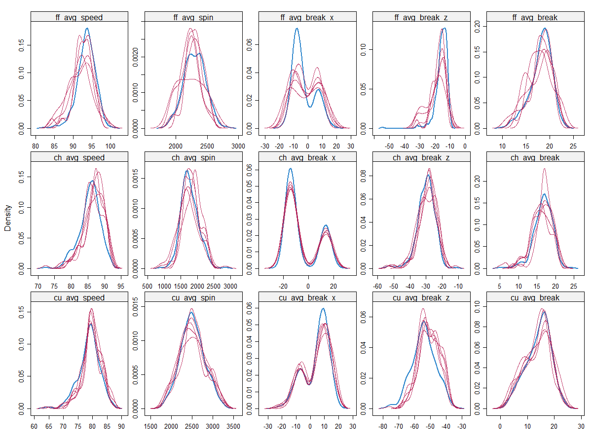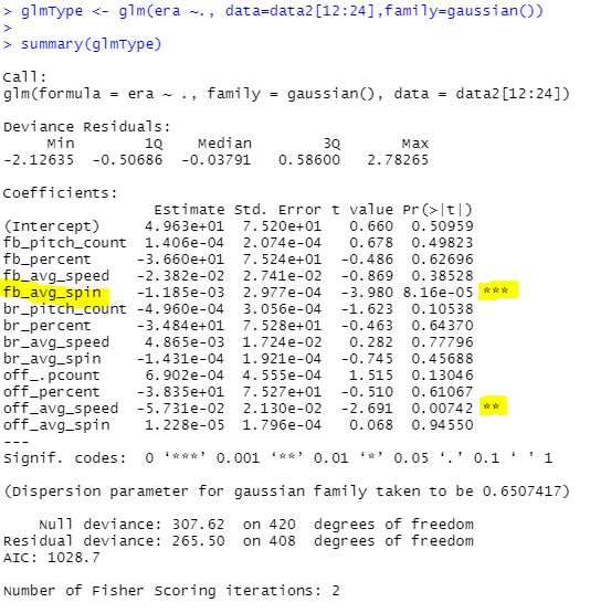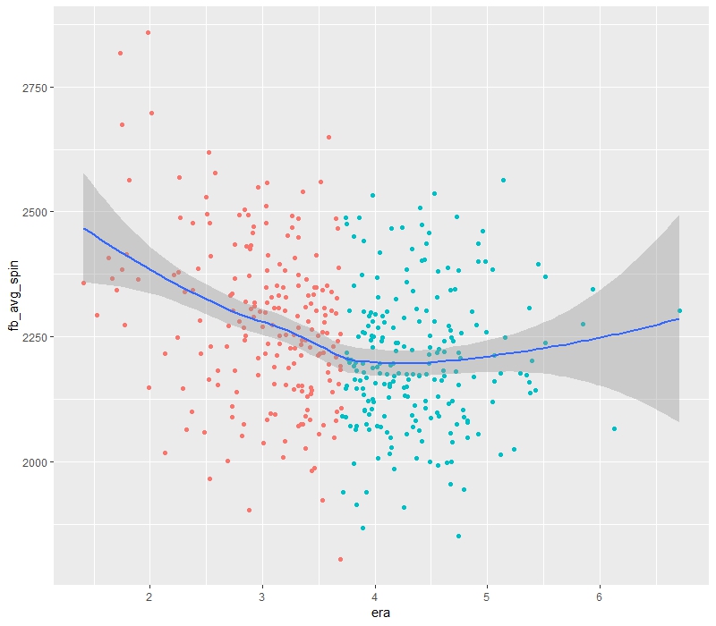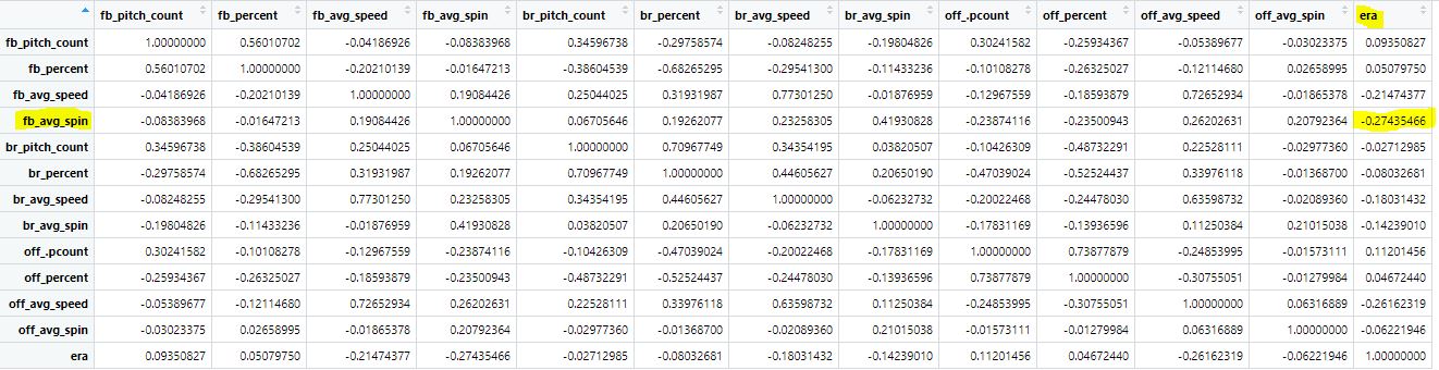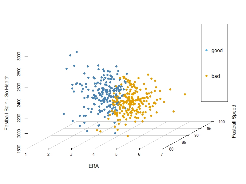 MLB Analytics - R MLB - R Initial Statistical Analysis: Click on image for a more detailed look A plot of fastball spin and speed that are grouped as a good ERA (< 3.70) or bad ERARegression on specific pitches onlyDistribution Curve - showing how close the replaced data (NA's) were to the actual data Initial Correlation MatrixRandom Forest regression - ERA on specific pitch stats onlyA scatterplot with three layers that show different statistics of the same data: points (era, fastball spin and the color is good/bad classification).